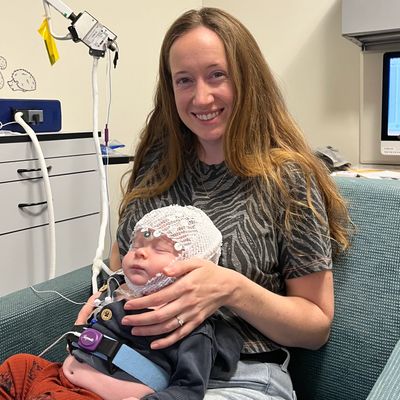 Next, our team will take you and your baby into our EEG room to set up for the EEG portion of the study visit! Your baby will be sitting on your lap while our team gets them set up.